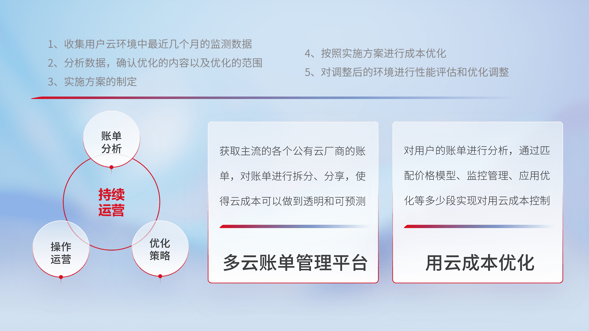 通过多云纳管,,,,以统一的资源数据模型把客户的云资源进行抽象和封装,,,进而实现对多云资源的统一操作,,,保障云资源管理的可靠性、、、、稳定性与可用性。。量身定制化运维内容,,配置、、开发运维、、、补丁管理、、、、备份、、监控、、、认证和访问管理、、、审计和日常巡检等,,,,保障在用云过程中的可靠度,,,,稳定度以及高可用率。。。